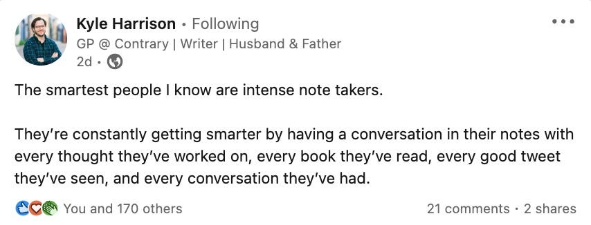 There’s an argument I initially thought I might make here that would have gone something like this: if you don’t produce things with your notes, you’re wasting your time by taking notes.