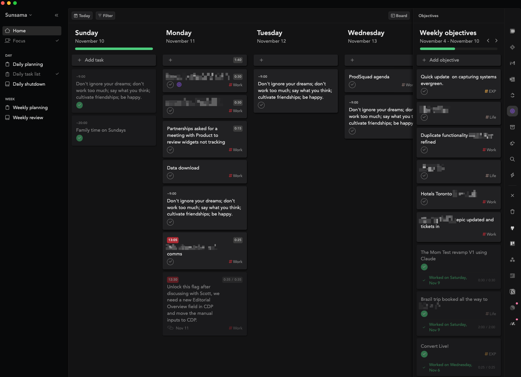 I’ve been back to Sunsama for two years now, that was my third attempt to make this tool work as my main “week view” for the system. I don't use many of their integrations, the tool became quite evolved, the week board, weekly goals, and review rituals became integral to my ways of working.
