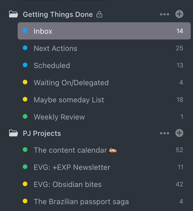 ⚙️ ClickUp is where GTD-like project management lives. It acts as my centralized inbox and control panel for everything I capture, "stuff" pending to be processed, tasks I need to deliver, and projects aligned with my priorities.