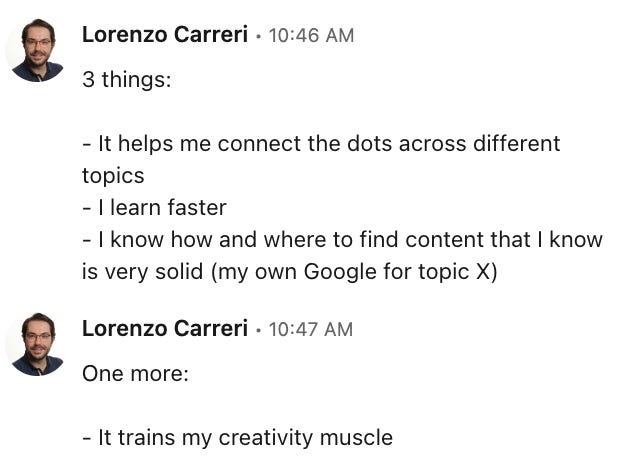 If you are a knowledge worker like me, it's part of your job to take notes, triangulate findings, and act on them. The note-making system is how I found harmony in getting things done. It makes me feel proactive about my information diet.