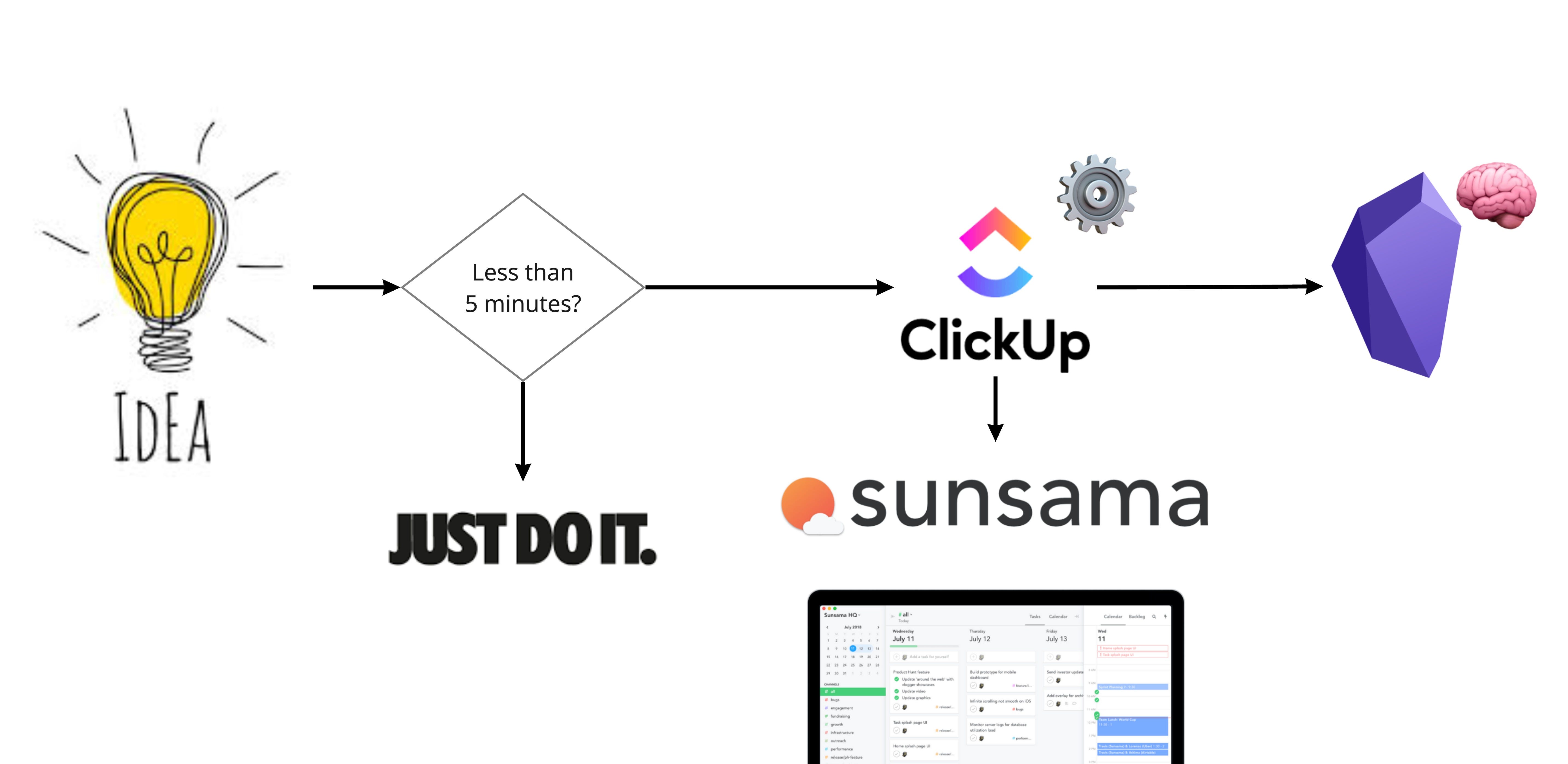 The core change introduced by this tool is that Next Actions that used to live in ClickUp was deprecated. Next Actions live in Sunsama and are acted in the short term through the week board, it's a very smooth workflow of blocking time ahead and making promises with yourself.